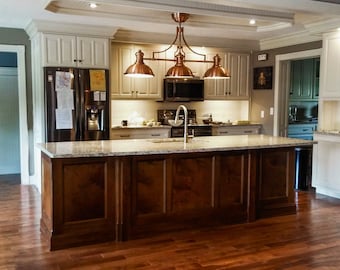 Currently, The trend in lighting is the bigger, the better. Check out pinterest and interior decorating blogs, the lights are big big big! Grouping in odd numbers is the way to go! I am putting three almost 10" pendants over my 6" island. Also, ours are clear glass so they will not take up much "visual" space. This item: 6 ft. Outdoor Kitchen Island Frame Kit with Bartop. $960.29. Cal Flame Outdoor Kitchen 27 in. Stainless Steel Horizontal Storage Door. $234.00. Cal Flame 4-Burner Built-in Propane Gas Grill in Stainless Steel with Accessory Kit. $1630.00 $1549.00.