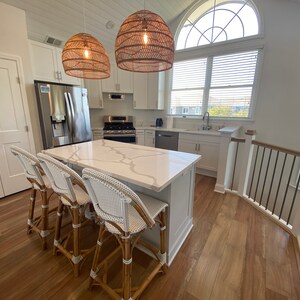 The island dimensions are 6'-6" x 8'-6". The ceiling is constructed with Nantucket MDF beadboard. (via Douglas VanderHorn Architects) 13. The kitchen island of this Minnesota home is illuminated by Elise pendant lights sourced from Elk Lighting ( source ). The island cabinetry is a custom-mixed color.