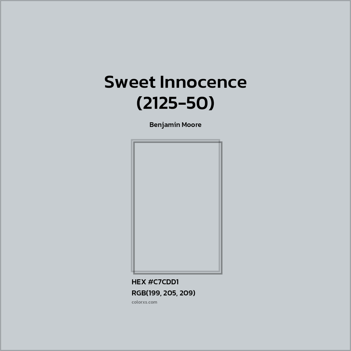Benjamin Moore Sweet Innocence / 2125-50 / #c8ced2 Hex Color Code. The hexadecimal color code #c8ced2 is a light shade of cyan-blue. In the RGB color model #c8ced2 is comprised of 78.43% red, 80.78% green and 82.35% blue. In the HSL color space #c8ced2 has a hue of 204° (degrees), 10% saturation and 80% lightness.