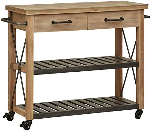 This kitchen island cart has a large butcher block style top to prepare food while the 2 drawers, bottom shelf, and cabinet offer storage for various kitchen essentials and dry goods. The handle on the side allows you to easily maneuver the rolling cart around your kitchen and can also be used as a towel rack.