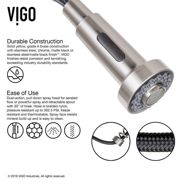 Write a review The pull-down, dual action spray head on the VIGO Edison Pull-Down Spray Kitchen Faucet allows for your choice of aerated flow or powerful spray for all your modern kitchen needs. The 360° swivel spout extends up to 30", and its spiral details and solid brass construction make it a highly functional and beautiful statement piece.