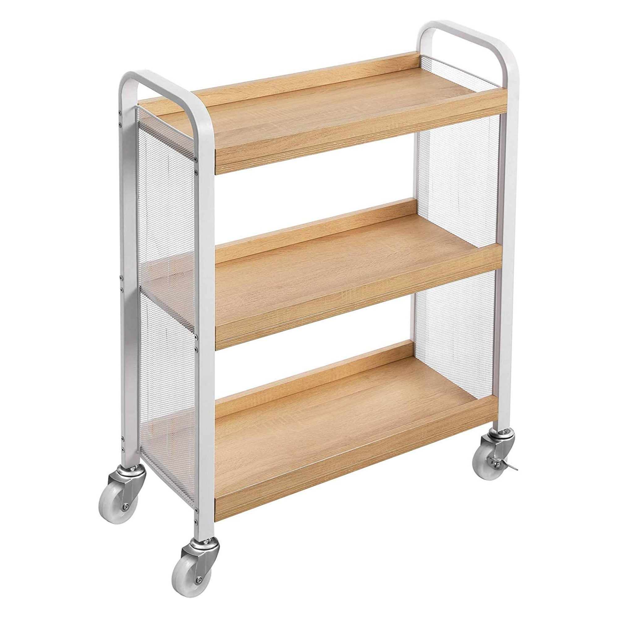 MOOACE Rustic Kitchen Cart on Wheels, 3-Tier Wire Storage Rolling Cart, Wood Look Top and Metal Frame, Silver