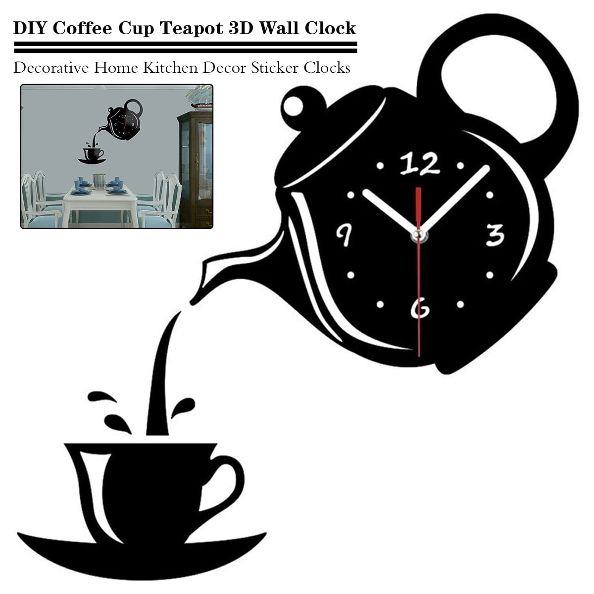 TOPmountain DIY 3D Wall Clock Acrylic Coffee Cup Teapot Shape Decorative Kitchen Wall Clocks Living Room Dining Room Home Decor Clock Stickers ...