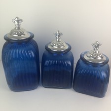 Cobalt Blue Lidded Glass Canisters Set of 3 | Antique ... $48.00 Description Our Cobalt Blue Lidded Glass Canisters Set of 3 is a nostalgic reference to vintage medicine bottles from general store pharmacies. Each canister is hand finished with attention to detail and style. Use this canister set for crafting organization kitchen canisters or bathroom displays.