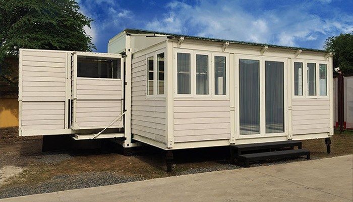 Off-Grid Container Home Design | Living in a Container Listing of different portions of the container home. ⦁ Two bedrooms ⦁ Two bathrooms ⦁ One kitchen ⦁ One dining table ⦁ One living room Detail of all portions of the shipping container home. The black colored wooden door is on the entrance of the home. The floor ia also made of wood. The support around the windows of the home is also painted black.