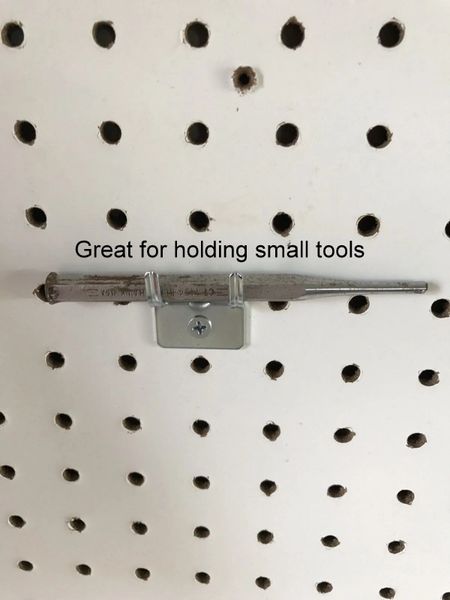 Small J Hooks For Pegboard Perfect for storing smaller tools such as: - Thin paint brushes. - Keys. - Storage pouches. - ... 10 Hooks in one hook pack. Attached with double pegs. Works with all standard 1/4" holed pegboard. 2-3x thicker gauge steel: Easily supports up to 50LBS.