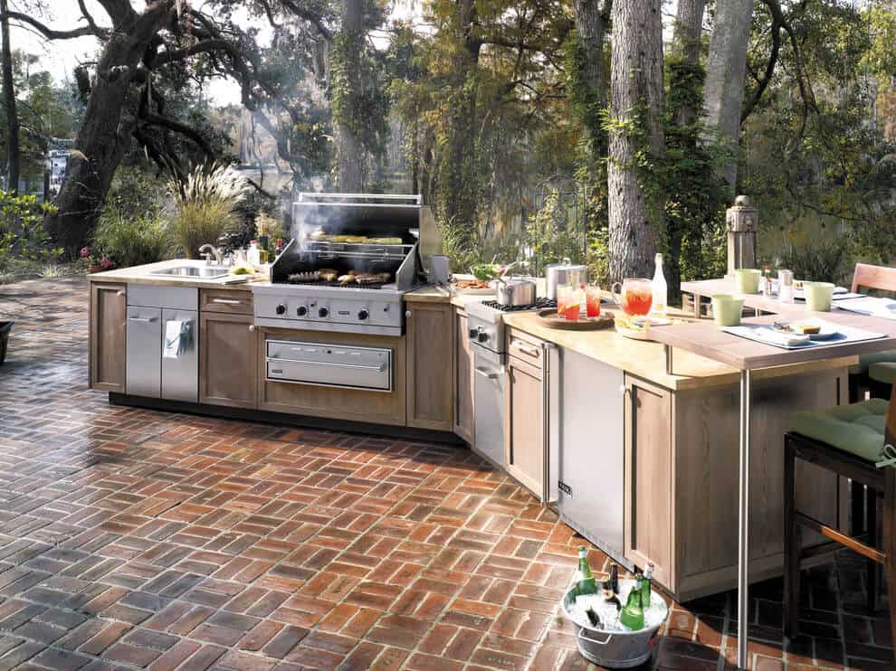 10 DIY Outdoor Kitchen Ideas 2022 (Saving the Budget) The outdoor kitchen takes L-shaped in fair, available space. Red bricks color half of the wall that can further function as the backsplash of the kitchen. The same bricks serve as the pillars of the sort of kitchen island. You can place ready-to-serve meals on top of the narrow table. Select marble or ceramics as the countertop.