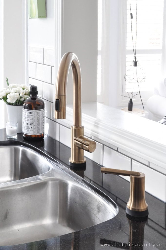Modern Farmhouse Kitchen in Black and White | Town & Country Living Mullioned windows take residence above the white farmhouse sink, wedged between black kitchen cabinets and gold hardware. And yes, gold is still in vogue - but note how the faucet is silver - proving it's okay to mix metals when decorating. Photo by reDesign home