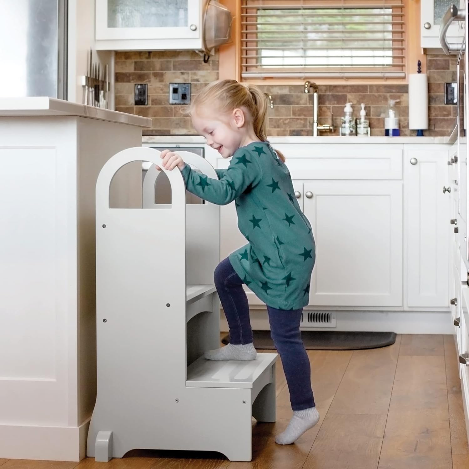 Step-Up Kitchen Helper for kids in the kitchen at PHG Step-Up Kitchen Helper, Espresso This sturdy step stool is designed to safely and securely elevate children to countertop height. With a better view and easier access, they can help in daily activities: baking, mixing, preparing food, cleaning up, or playing on the countertop near you as a meal is prepared. Kids' Step-up Kitchen Helper Gray - Guidecraft : Target Platform adjusts to two heights so it can grow with your child (14" and 17" platform) Operates as a handy step-up for adults. Sturdy, yet light enough to move easily even for a child. Assembly: Follow the simple step-by-step pictorial instructions. Material: MDF with a child-safe polyurethane finish. Assembled dimensions: 20"L x 22.3"W x 36"H. Guidecraft High Rise Step-Up Kitchen Helper - Natural Great for a kitchen, playroom or bathroom. Features hand-holds to assist in climbing up and down; side panels and textured, non-slip stair treads. Safely supports up to 125 lbs. Designed and engineered for ages 2+. 21″L x 17″W x 32″H. Step height measures 7″/14″ from the floor. Sturdy step stool designed for hard-to-reach home areas
