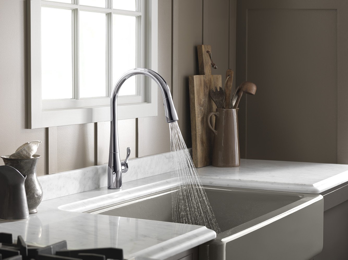 KOHLER K-596-VS Simplice Kitchen Faucet, Vibrant Stainless KOHLER K-596-VS Simplice Kitchen Faucet, Vibrant Stainless. Product Description & Features: Pull down kitchen faucet: Allows you to control water with one hand and reaches beyond the sink to complete other kitchen tasks; 3 function spray head: Includes stream, boost, and sweep spray technologies. Boost allows you to increase flow rate by 30 ...