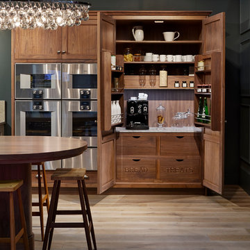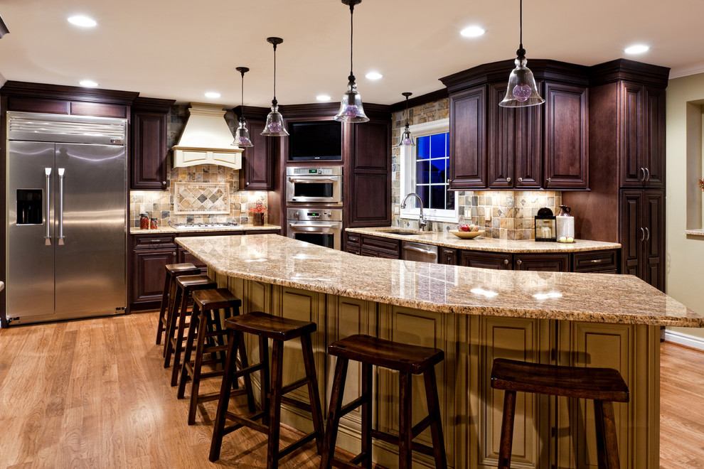 Transitional Kitchen with Dark Wood Cabinets Ideas - Houzz Eat-in kitchen - mid-sized transitional u-shaped cork floor eat-in kitchen idea in Jacksonville with recessed-panel cabinets, dark wood cabinets, an island, marble countertops and green countertops Save Photo Rich dark stain on custom maple cabinets by Wood-Mode. Custom tall oven cabinet Bay Area Kitchens