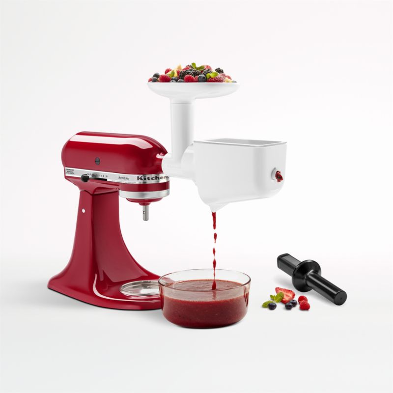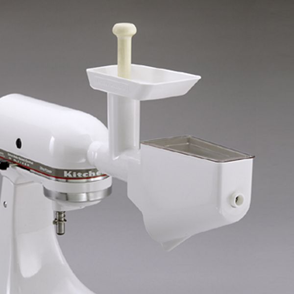 KitchenAid Fruit & Vegetable Strainer Set With Food Grinder Attachment ... The multiuse attachment has a food grinder with fine and course plates and a strainer to strain and purée fruits and vegetables. The product, compatible with all household KitchenAid stand mixers, is great for those who want to make their own sausages and burgers and produce fruit- and vegetable-based sauces.