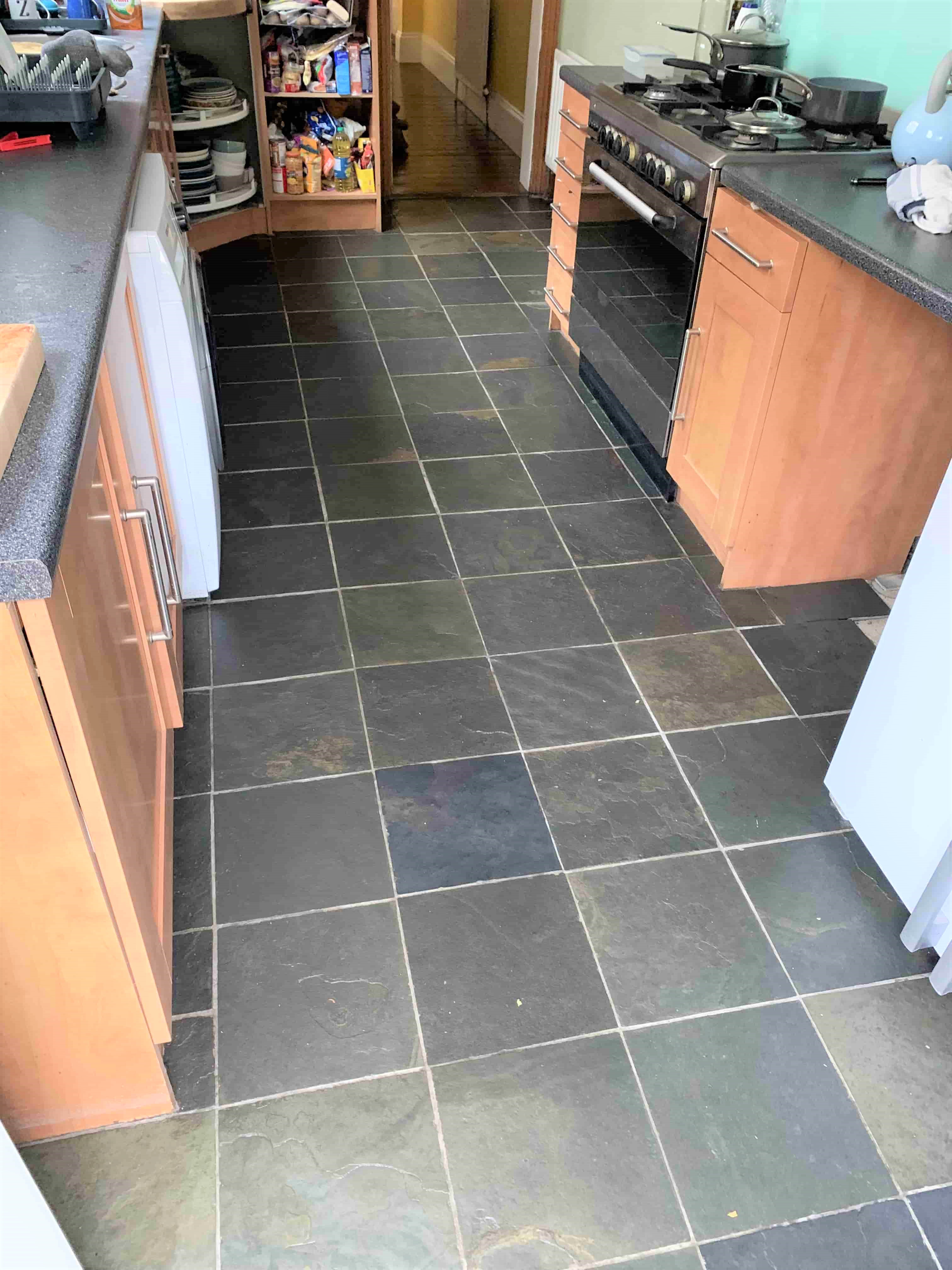 Slate kitchen flooring - a guide to getting it right | Livingetc Slate flooring suits a variety of kitchen styles (Image credit: deVOL) Whatever kitchen style you have or plan to install, from shaker and retro to sleek and modern kitchens, a slate stone floor provides a practical solution underfoot. Recognized mainly for its dark grey hue, it's a tone that complements both contemporary and classic interiors.