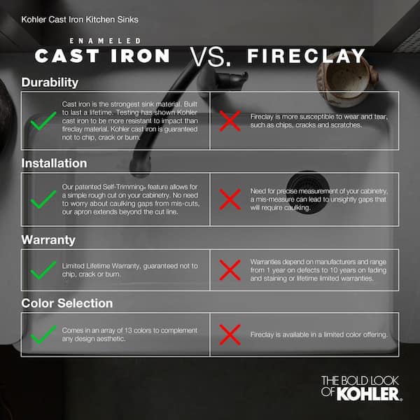› KOHLER-K-6489-47-Whitehaven-SelfKOHLER K-6489-47 Whitehaven Farmhouse Self-Trimming Apron ... The Kohler Whitehaven apron-front single-basin sink is made of enameled cast iron, has a self-trimming apron, and is easy to install (click each to enlarge). From the Manufacturer Constructed of durable KOHLER enameled cast iron, the Whitehaven self-trimming, apron-front sink features a clean, versatile design to complement any decor.