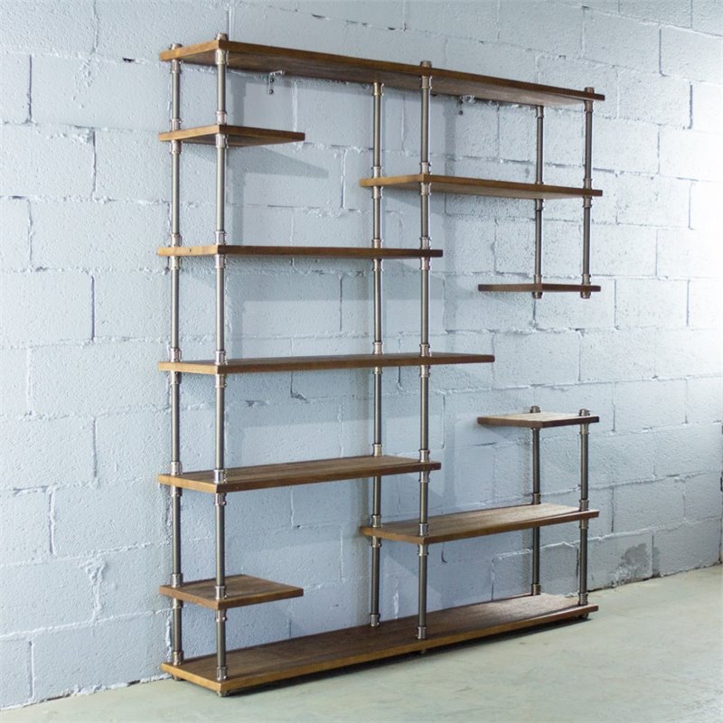 Nashville Industrial Mid-Century 64-Inch Wide Large Open Etagere 11-Shelf Pipe Bookcase Metal With Reclaimed Wood Finish - MOO1-BL/BL/BL