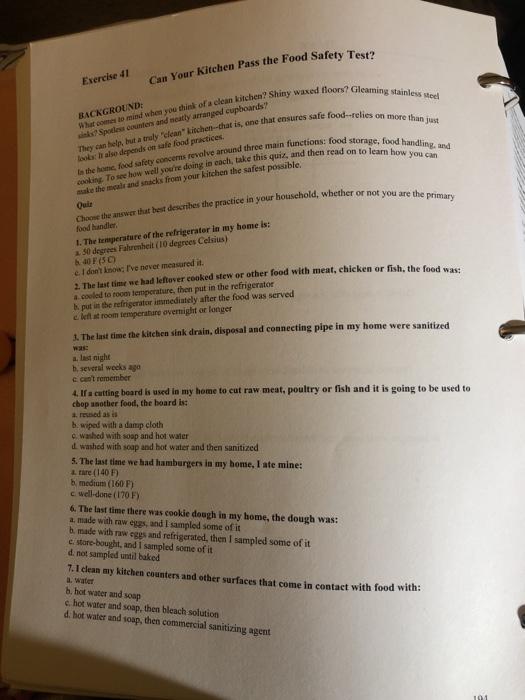 Kitchen and food safety test Flashcards | Quizlet Kitchen and food safety test. Flashcards. Learn. Test. Match. Flashcards. Learn. Test. Match. Created by. Carly_Pfeifer. Terms in this set (16) steps to contain a fire that starts in the oven. Turn off oven, keep oven door closed. what to remember to keep yourself safe when making doughnuts. PDF Can Your Kitchen pass the food Safety Test.ppt - ulstercountyny.gov The last time the kitchen sink, drain and piping was sanitized was… The answer is A. The kitchen sink, drain, and piping should be sanitized periodically with a solution of 1 teaspoon chlorine bleach to 1 quart of water. Dirty dishes, dirty hands, saliva, mop buckets, and backed up sewer lines, etc.