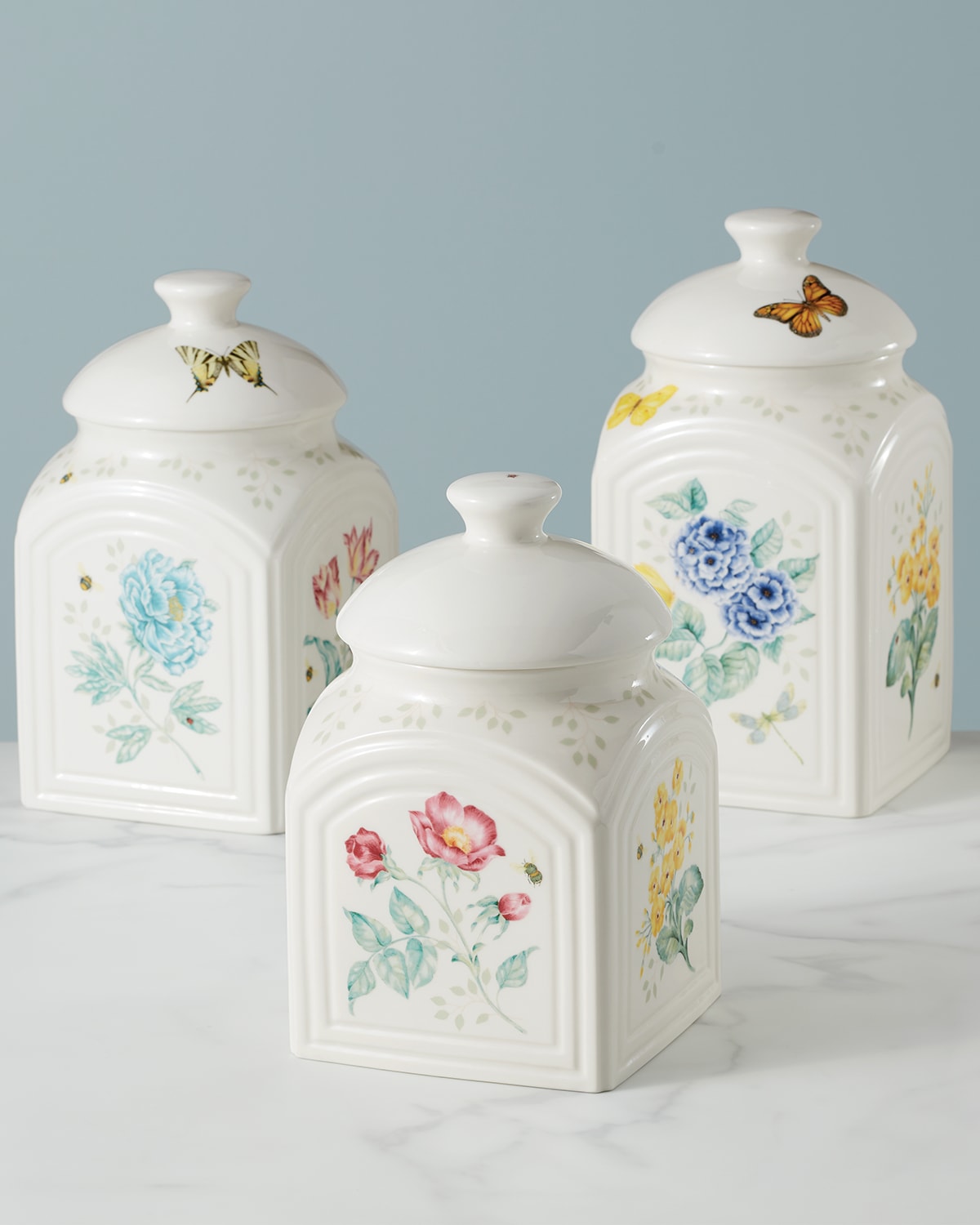 Floral Butterfly Dinnerware & Canister Sets | Country Door Instantly brighten your kitchen with these cheerful coordinating sets. Hand painted and decal design on glazed ceramic. Dinnerware Set: Set includes 4 each 10 1/2" dinner plate, 7 1/2" salad plate, 21-oz. bowl and 12-oz. mug. Dishwasher and microwave safe. 4-Piece Canister Set: Lids with sealing gaskets have figural handles. Includes 23-, 36-, 52- and 82-oz. sizes. 4 1/4-6 1/4" diam. x 6-9 ...