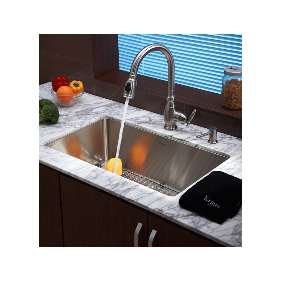 Kraus KHU123-32-KPF2150-SD20 32 inch Undermount Double Bowl Stainless ... The KPF-2150 pull-down kitchen faucet has a faucet height of 16.34", a spout height of 8.27", and a spout reach of 10.04". The SD-20 soap dispenser has a height of 3", reaches 4.5", and swivels for about 360 degrees. It holds 14 ounces of liquid and is refillable. This dispenser requires a 1.25" hole.