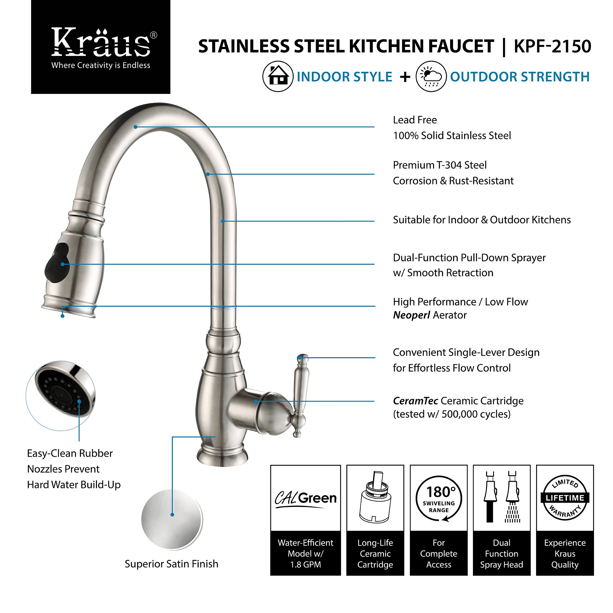 Kraus KPF-2150-SD20 Single Lever Stainless Steel Pull Out Kitchen ... Lead-free solid stainless Steel construction with superior finish Premium t-304 Steel is corrosion & rust resistant Suitable for indoor & outdoor use Convenient single-lever design for effortless flow control Dual-function pull-down sprayer with secure docking & retractable hose with counter weight Lead-Free Solid Stainless Steel Construction w/ Superior Finish Premium T-304 Steel is Corrosion ...