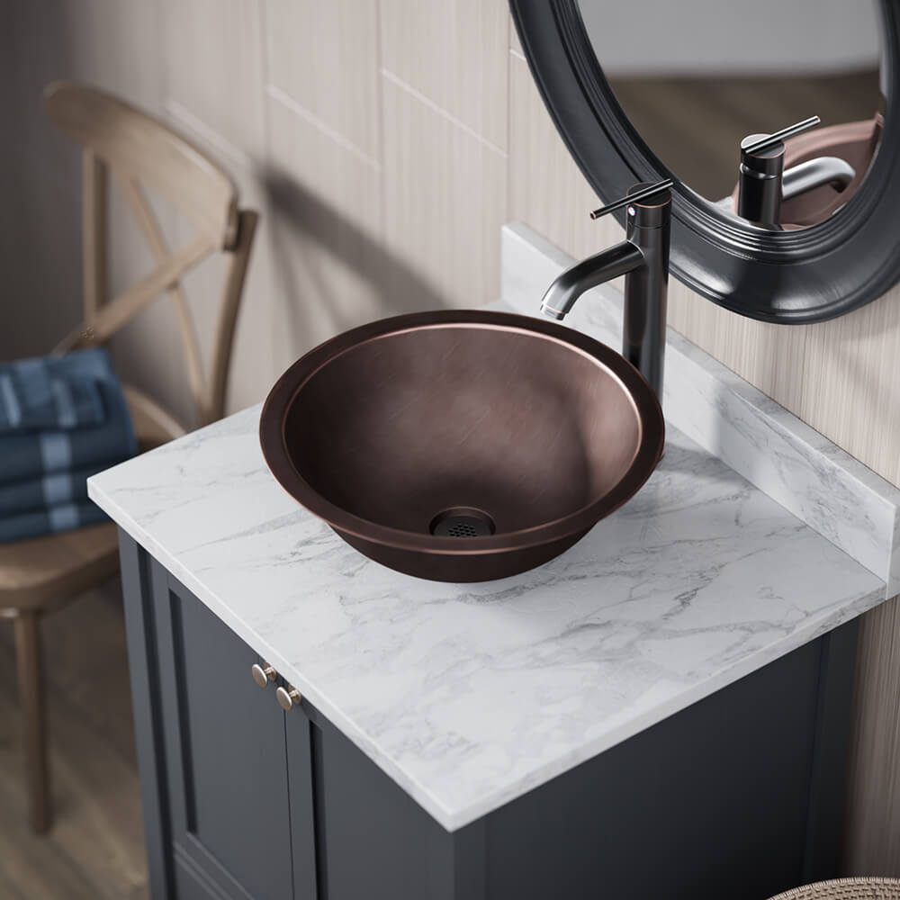 Copper Circular Dual Mount Bathroom Sink With Faucet This dual-mount bathroom sink is comprised of 99%-pure, mined copper, at a 16-gauge thickness; 25% thicker than the industry standard 18-gauge. The copper is naturally anti-bacterial and stain-resistant with an ever-changing patina, and is a one-piece construction, giving you a very strong and durable copper sink. This bathroom sink features hand-crafted copper details that are sure to add ...