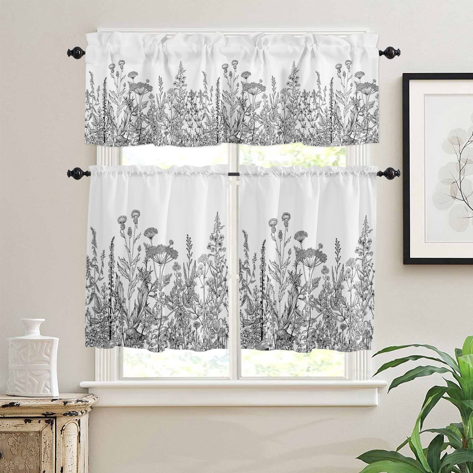 Kitchen Curtains and Valances Set 24 Inches, Black Lines Leaves and Flowers Blackout Rod Pocket Kitchen Curtain Valance and Tiers Set for Half Cafe ...