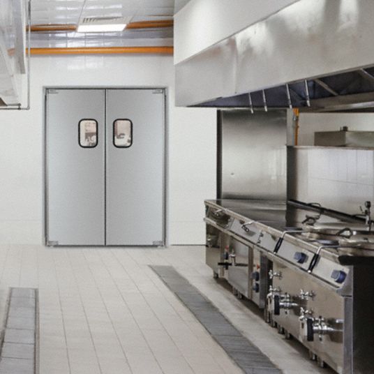 Kitchen Traffic Doors - Commercial Swinging Doors | Kitchenall Prepline 60" x 84" Double Aluminum Swinging Service Traffic Door with 9" x 14" W... Add to Cart Prepline 72" x 84" Double Aluminum Swinging Service Traffic Door with 9" x 14" W... Add to Cart Eliason 36" x 84" Single Aluminum Swinging Service Door with 9" x 14" Window Add to Cart Traffic Doors, Kitchen Doors and Restaurant Swinging Doors What is a Kitchen Door? A kitchen door (also known as a restaurant swinging door) is a double acting door that provides a barrier between two areas. This "barrier" can be visual, thermal, or both. "Double Acting" means that the door swings in either direction. Kitchen doors are designed to be opened by impact.