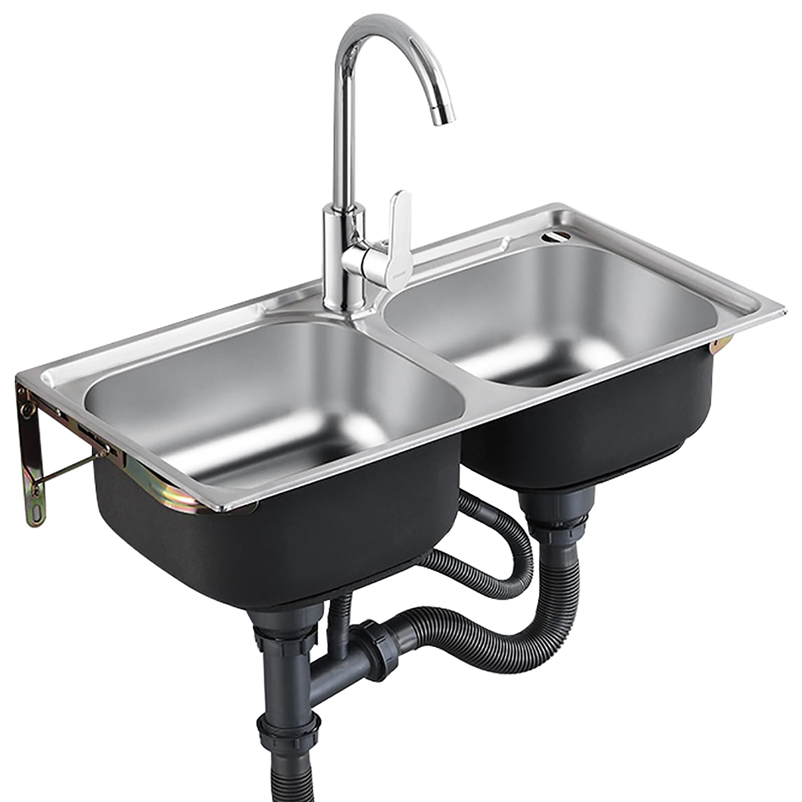 ZHIQ Double Bowl Wall Mounted Kitchen Sink, 7 Inches Deep Silver Stainless Steel Basin, Wall Hung Vessel Sink with Overflow Hole and Single Cold ...