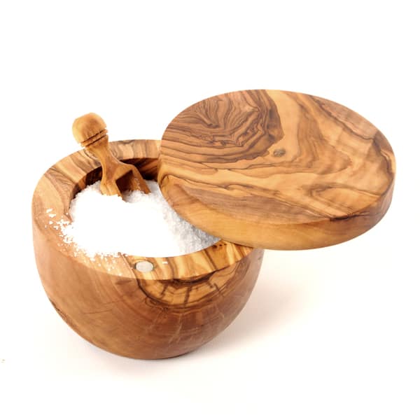 Naturally Med Olive Wood Salt Cellar with Inset Spoon A stunning large olive wood salt cellar. This salt keeper has a pivoting lid which closes with a magnet. Ideal for storing and serving salt or sugar this olive wood box will make a stunning addition to any kitchen. A clever design, this salt cellar has a beautiful salt spoon inset into the lid, which is held in place by a magnet.