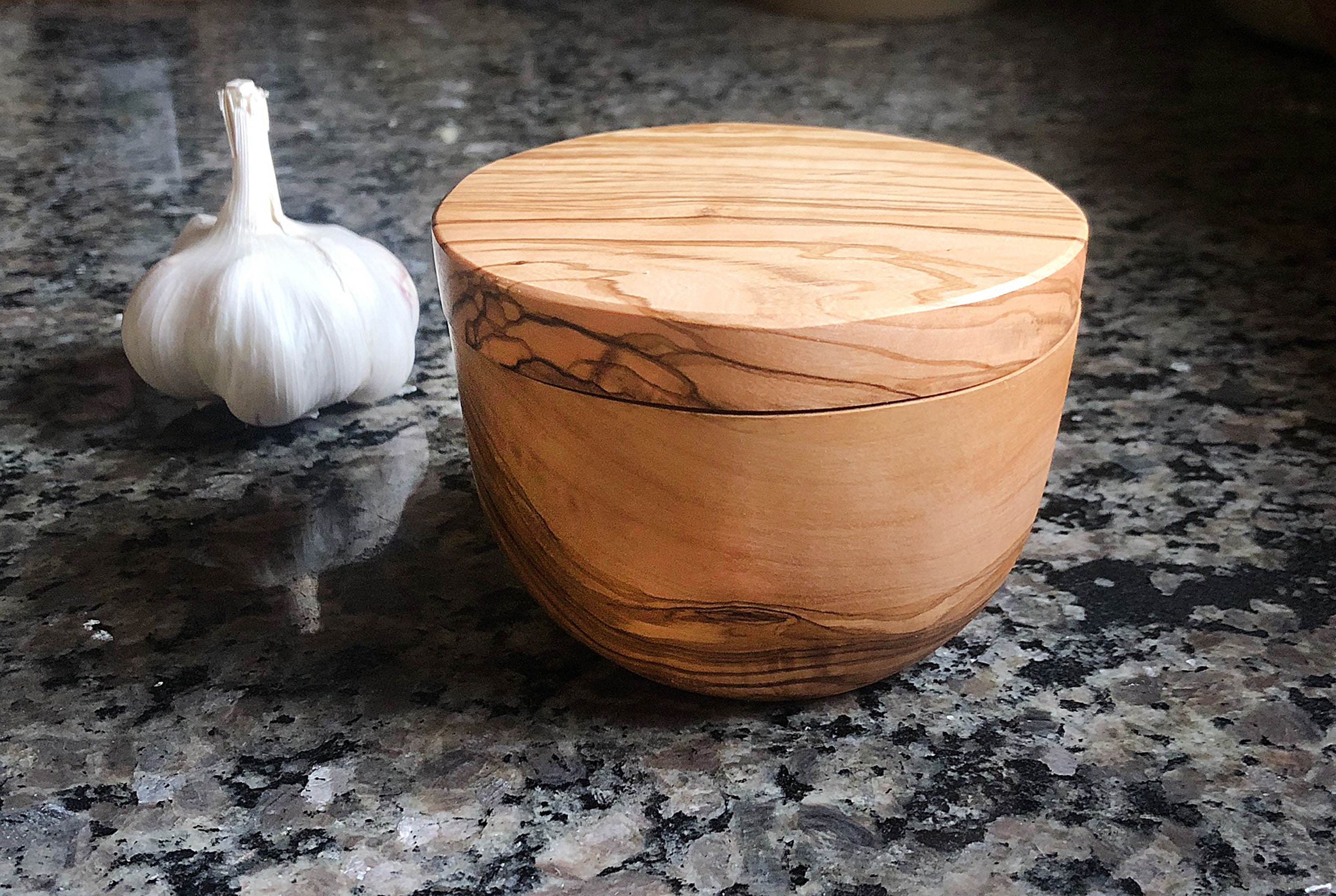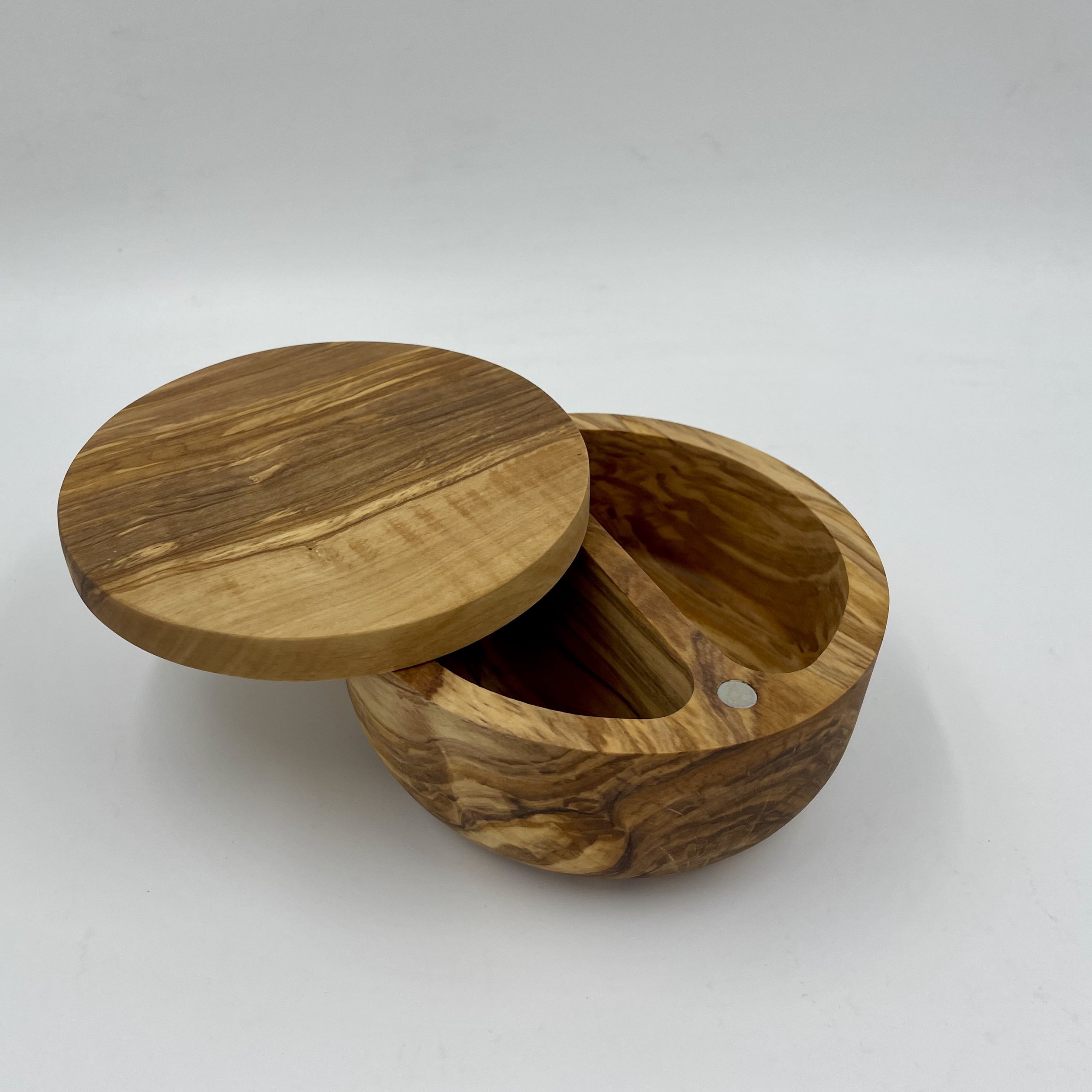 Salt Cellar - olivewoodware Salt Cellar - olivewoodware Handmade olive wood magnetic hinged top, it can be used to store salt without worrying about moisture. All products are made by artisans in Tunisia , out of trees that don't produce any more olives. Instead of using the wood for fire, we recycle it and carve our beautiful kitchenware. Care instructions: Hand wash and c